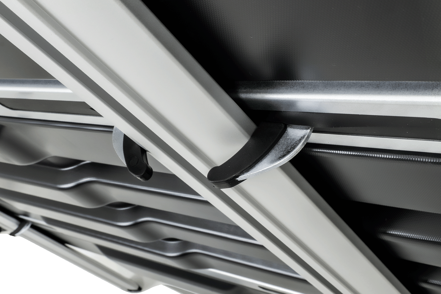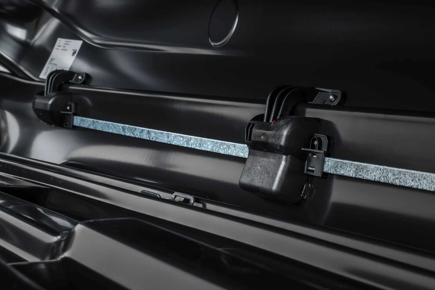 Dwustronne otwieranie ułatwia dostęp z chodnika lub strony jezdni – to szczególnie pomocne na zatłoczonych parkingach oraz przy długich trasach z częstymi postojami. Dynamiczne siłowniki stabilizują pokrywę w czasie załadunku i dociskają ją po zamknięciu, poprawiając uszczelnienie. Centralny 3-punktowy zamek jednym ruchem rygluje pokrywę w trzech miejscach, a klucz można wyjąć dopiero po prawidłowym zamknięciu pokrywy, co zwiększa bezpieczeństwo przewożonego bagażu.
