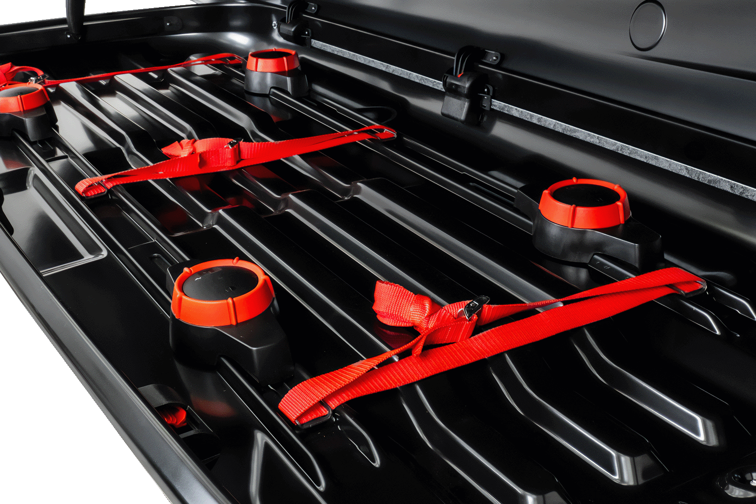 W zestawie znajdują się również paski tekstylne do zabezpieczenia bagażu (box Zenith posiada dedykowane miejsca do przymocowania pasków).