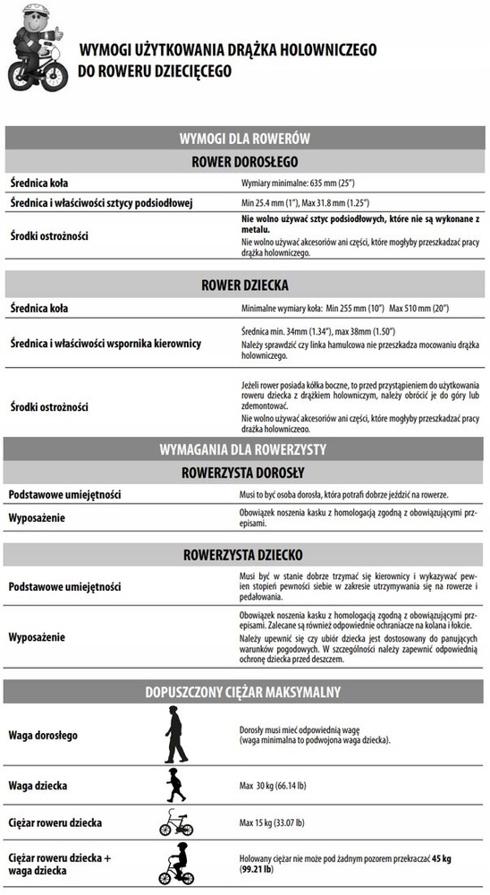 | Środki ostrożności | Jeżeli rower posiada kółka boczne, to przed przystąpieniem do użytkowania roweru dziecka z drążkiem holowniczym, należy obrócić je do góry lub zdemontować. Nie wolno używać akcesoriów ani części, które mogłyby przeszkadzać pracy drążka holowniczego. |