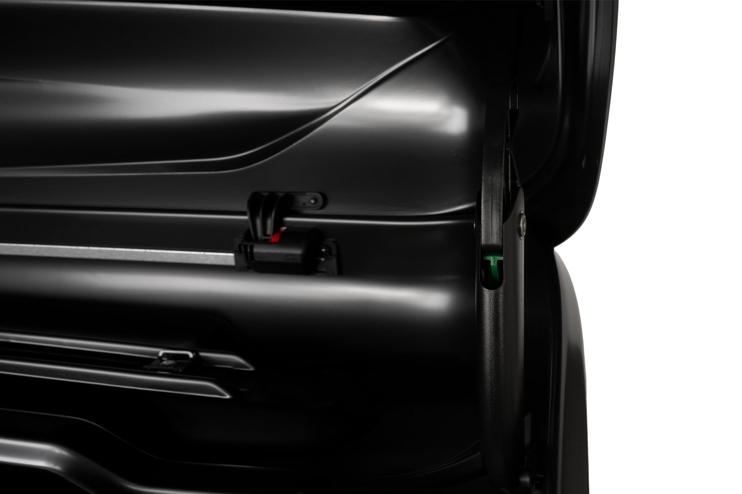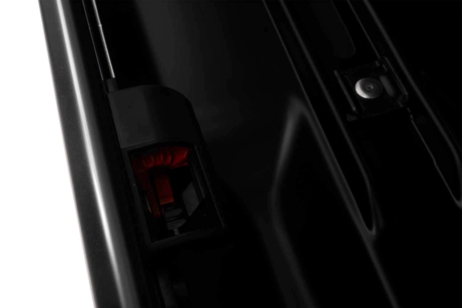 Aerodynamiczny kształt minimalizuje hałas podczas jazdy i ogranicza dodatkowe zużycie paliwa. Dwustronne otwieranie pozwala na łatwy dostęp zarówno od strony jezdni, jak i chodnika – co jest szczególnie pomocne na zatłoczonych parkingach. Pokrywa wspierana jest przez siłowniki, które utrzymują ją w stabilnej pozycji podczas pakowania i dociskają po zamknięciu, poprawiając szczelność. Centralny zamek z trzypunktowym ryglowaniem wraz z systemem zabezpieczającym w którym klucz można wyjąć dopiero po poprawnym zamknięciu boxu zapewnia bezpieczeństwo przewożonych bagaży.