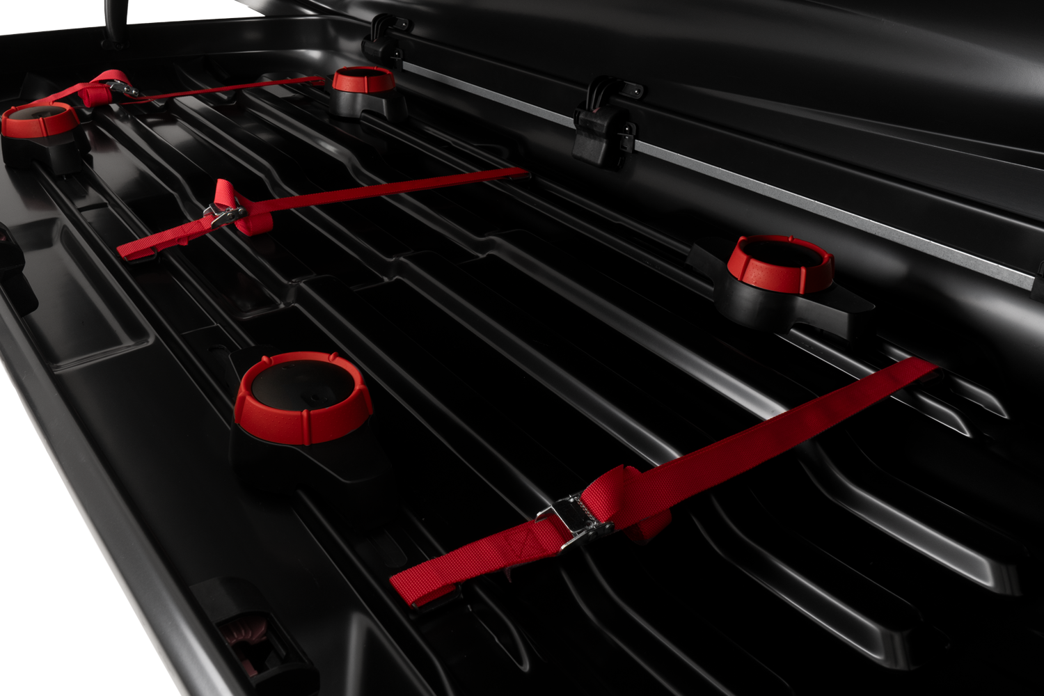 W zestawie znajdują się również paski tekstylne do zabezpieczenia bagażu (box Traxer posiada dedykowane miejsca do przymocowania pasków).