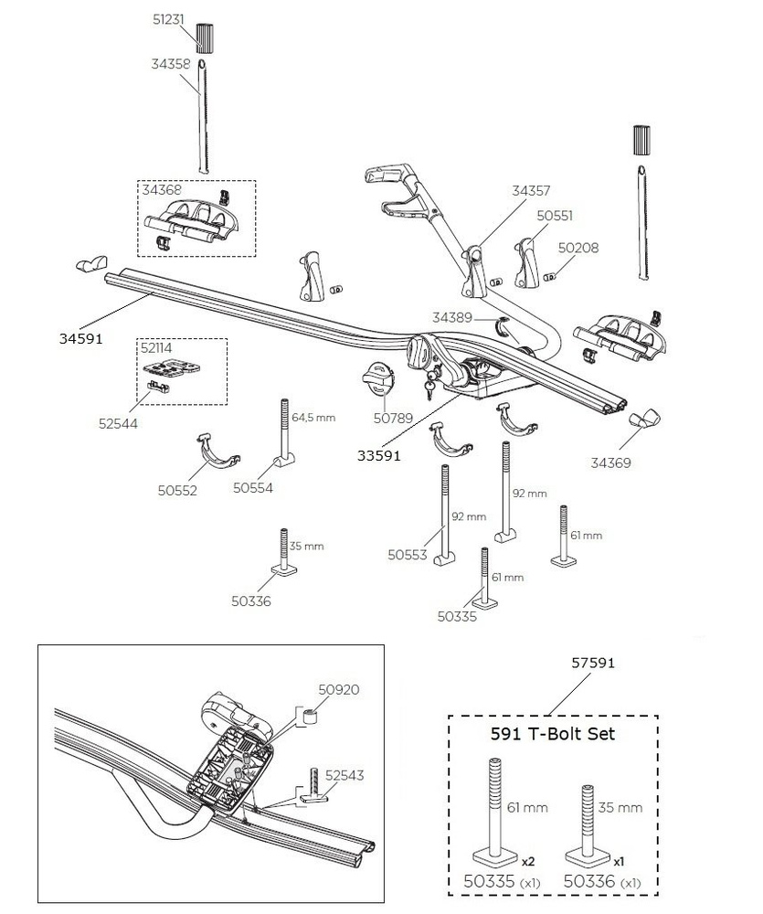 Szukasz części do uchwytu rowerowego Thule ProRide 591. Znajdź na obrazku numer części, wybierz go z listy i dodaj do koszyka ilość, której potrzebujesz.