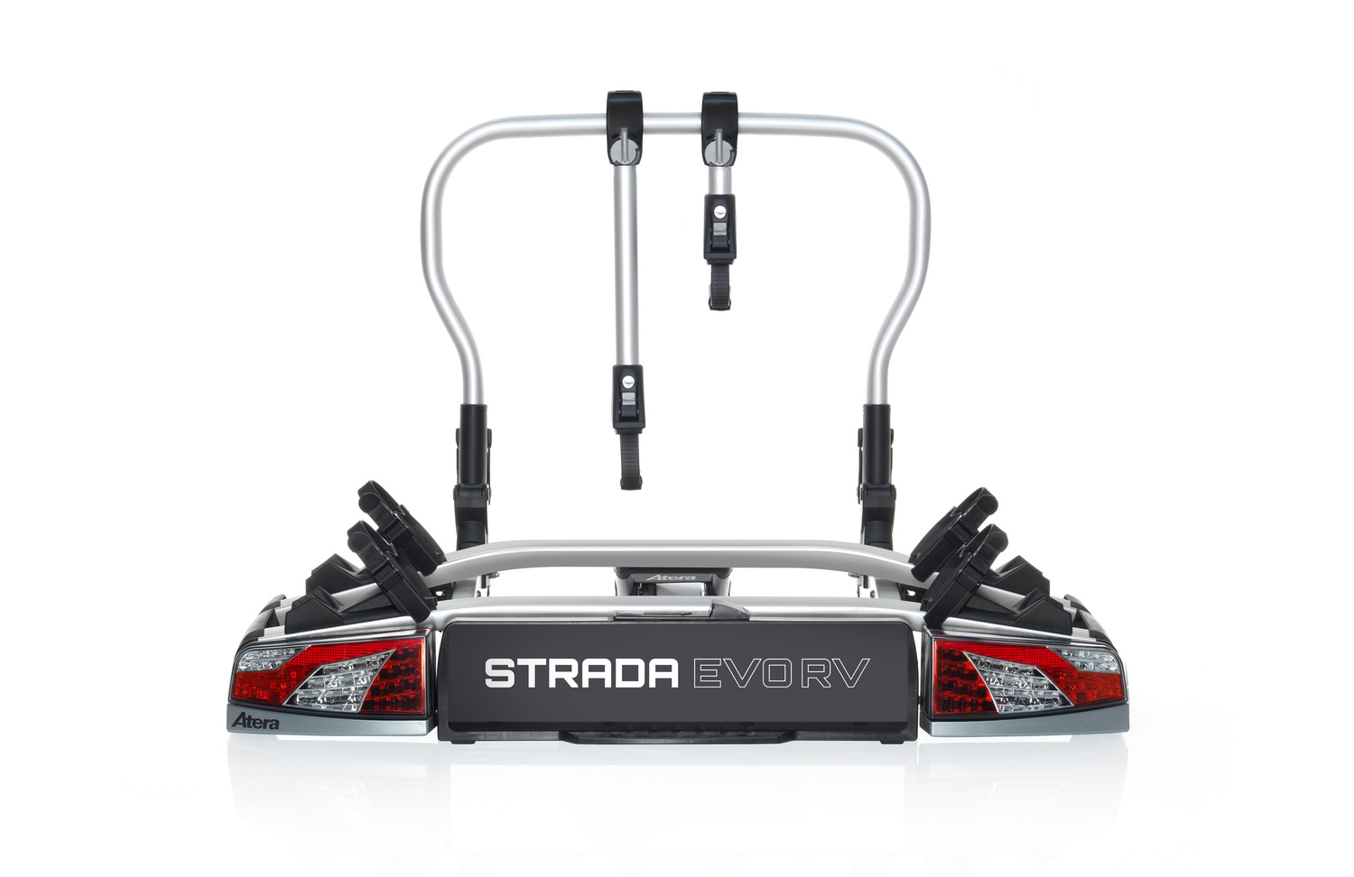 - Atera Strada EVO RV 2 to platforma dedykowana do kamperów lub innych pojazdów z klapą bagażnika otwieraną na boki. Tylne światła charakteryzują się nowoczesnym wyglądem i dobrą widocznością. Posiada możliwość rozbudowania do 3 rowerów.