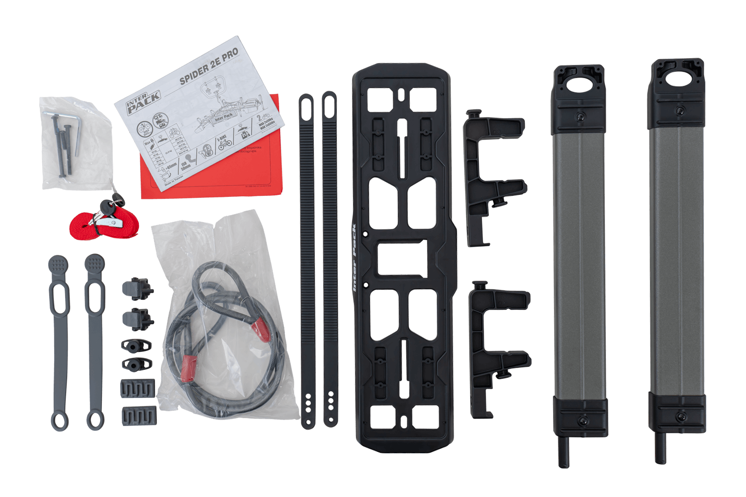 - Inter Pack Spider 2E PRO to solidny bagażnik na 2 rowery elektryczne (do 30 kg każdy). Szybki montaż Conical, funkcja odchylania, składana konstrukcja i 13-pinowa wiązka świateł zapewniają wygodę oraz pełne bezpieczeństwo.