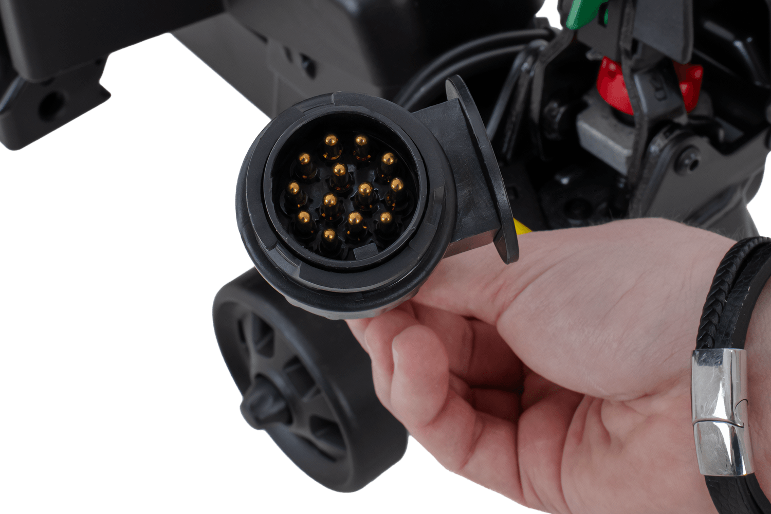 Dla pełnego bezpieczeństwa platforma posiada 13-pinową wiązkę elektryczną obejmującą wszystkie wymagane światła: pozycyjne, stop, kierunkowskazy, przeciwmgielne, cofania oraz oświetlenie tablicy rejestracyjnej. Dzięki temu spełnia aktualne europejskie normy bezpieczeństwa.