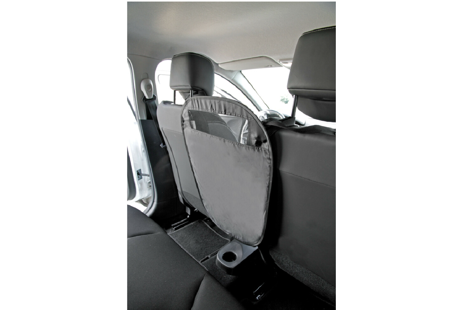Wymiary bariery: 50 × 66 cm. Montaż odbywa się za oparciami przednich foteli – barierę mocuje się do zagłówków oraz podstaw siedzeń za pomocą wytrzymałych pasków i klamer. Instalacja jest szybka i nie wymaga użycia narzędzi, a uniwersalna konstrukcja pozwala dopasować ją do większości samochodów.