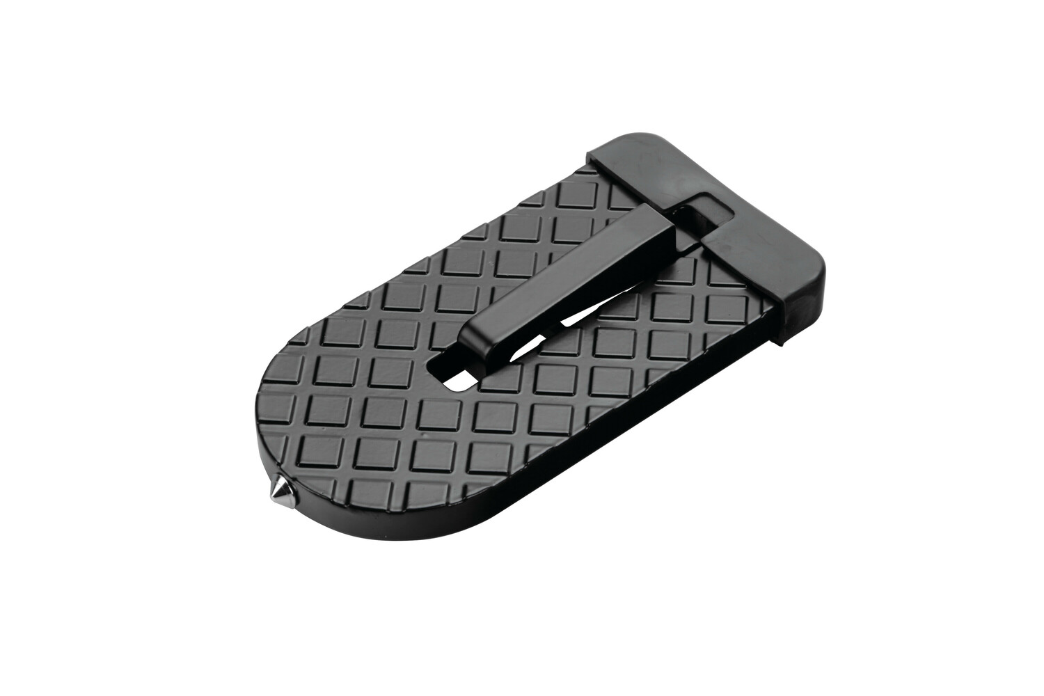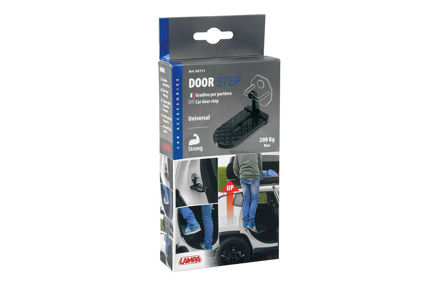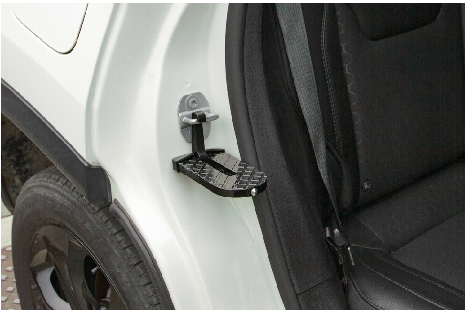 Montaż jest szybki i nie wymaga narzędzi – wystarczy zaczepić stopień w zaczepie zamka drzwi. Po zakończeniu użytkowania akcesorium można łatwo schować w schowku lub bagażniku. Konstrukcja wykonana ze stopu aluminium zapewnia wytrzymałość, a gumowa podpórka ochronna zabezpiecza lakier oraz słupek drzwi przed zarysowaniami.