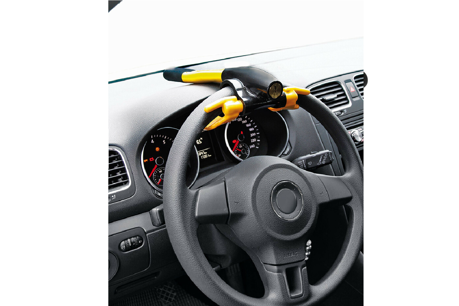 Po zamontowaniu blokada pozostaje dobrze widoczna z zewnątrz, co dodatkowo zwiększa efekt odstraszający i podnosi poziom ochrony pojazdu.