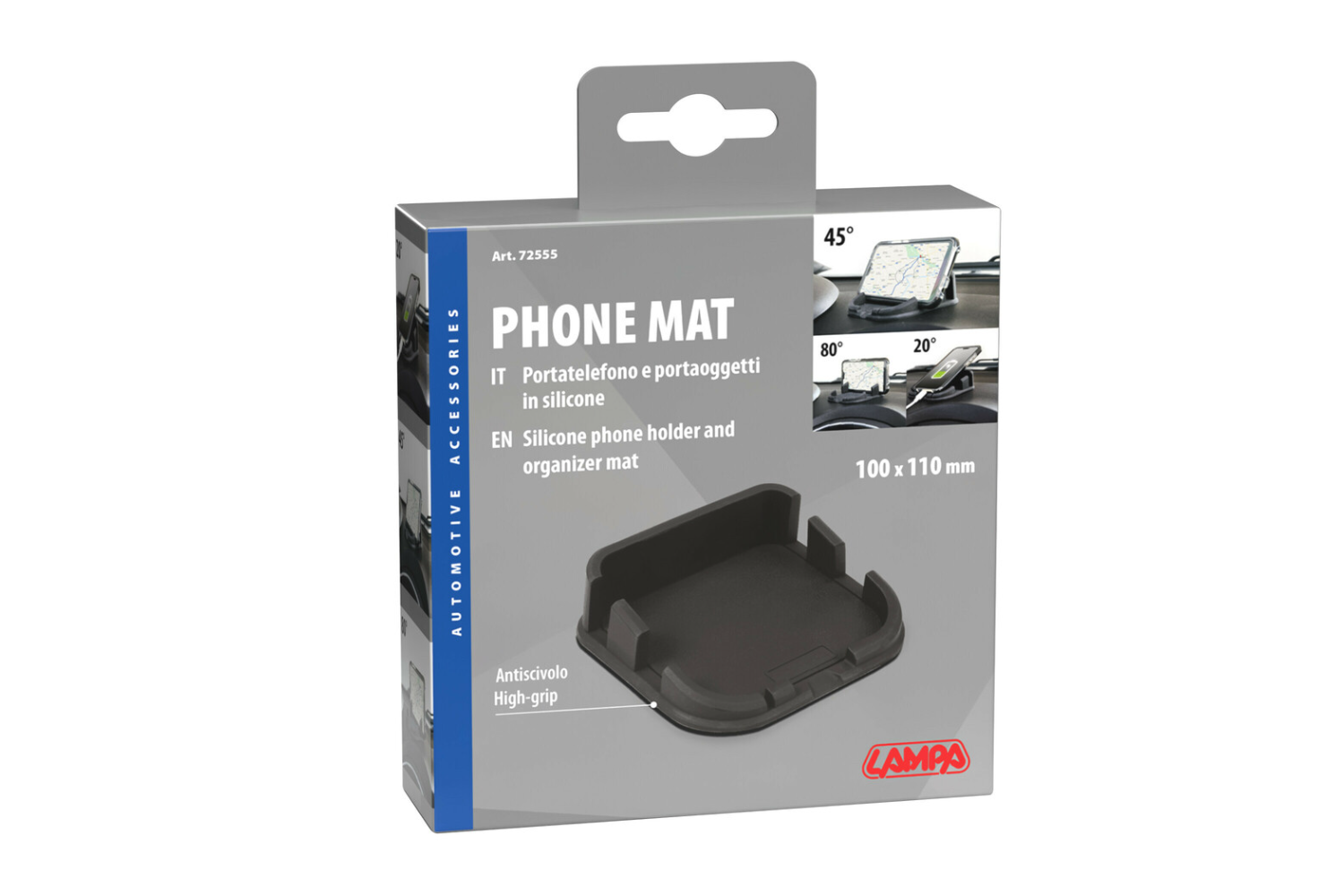 Silikonowa mata – uchwyt na telefon 110 × 110 mm to kompaktowy organizer na deskę rozdzielczą, który pozwala wygodnie przechowywać smartfon i drobne przedmioty w zasięgu ręki. 3-stopniowa regulacja kąta (20° / 45° / 80°) umożliwia ustawienie telefonu w wygodnej pozycji do korzystania z nawigacji lub rozmów w trybie głośnomówiącym. Dodatkowy otwór na przewód pozwala ładować urządzenie podczas jazdy.