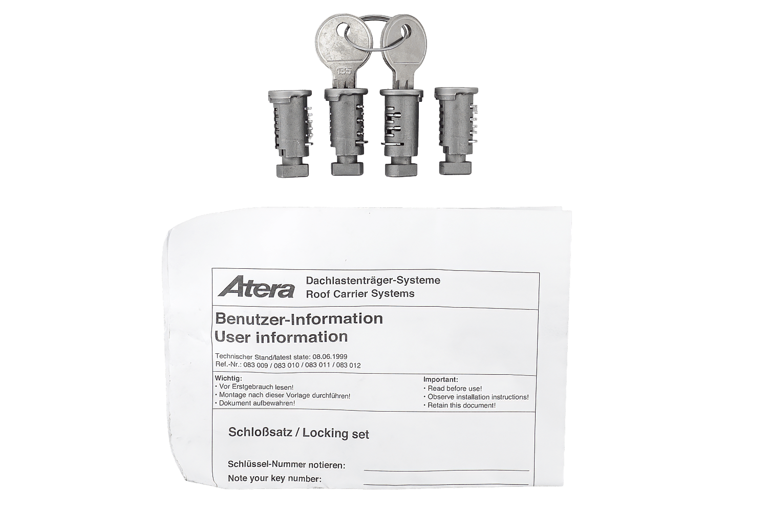 - Zestaw zamków Atera 4 zamki i 2 klucze umożliwia skuteczne zabezpieczenie bagażników i akcesoriów. Zapewnia trwałość, pewne działanie oraz zwiększa bezpieczeństwo użytkowania.