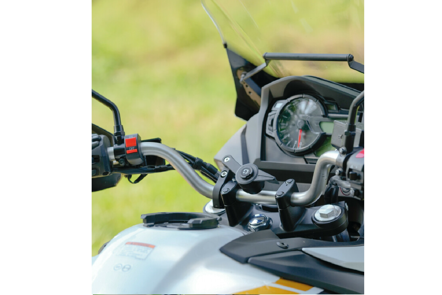 Uchwyt wyposażono w zintegrowany system tłumienia drgań, który pomaga chronić smartfon lub kamerę przed wibracjami powstającymi podczas jazdy po nierównej nawierzchni. Obracany przegub ramienia pozwala ustawić urządzenie w optymalnej pozycji, zapewniając dobrą widoczność ekranu podczas jazdy. W komplecie znajduje się również adapter do kamer sportowych, który zwiększa funkcjonalność uchwytu.
